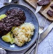 - Aussehen: Das Gericht besteht aus zerkleinerter, dunkelroter bis schwarzer Blutwurst, die in der Pfanne zu einer breiigen Masse wird.